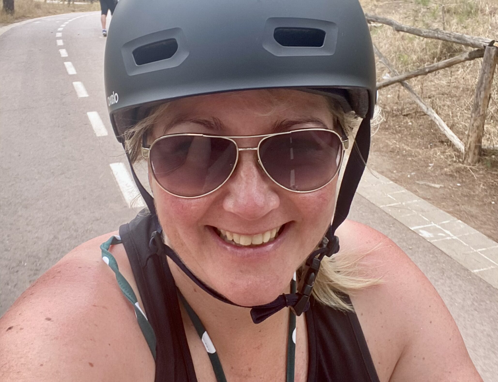 Tijdens dezelfde vakantie met de camper gingen we met z’n drieën met de fiets op pad. Als je dan toch vier fietsen mee hebt… Plus alles liever dan met de camper rijden. In het begin was het heerlijk. Mooi pad langs het strand met koeien in de wei, gezellige eettentjes, groen. Het was een ontspannen rit. Tijl en ik fietste met helmpjes op, zoals het hoort. Want verplicht in Spanje en natuurlijk safety first hè. Martijn zonder, want “veel te heet”.